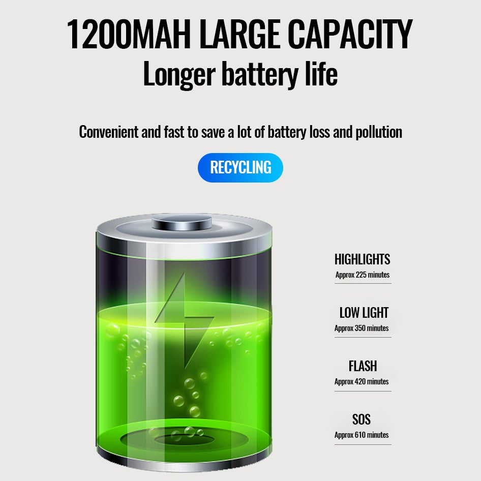 【USB Rechargeable】With Built-in 1200mAh lithium battery,used more convenience .With USB charging port, approx. 225 minutes In Strong Light Mode.