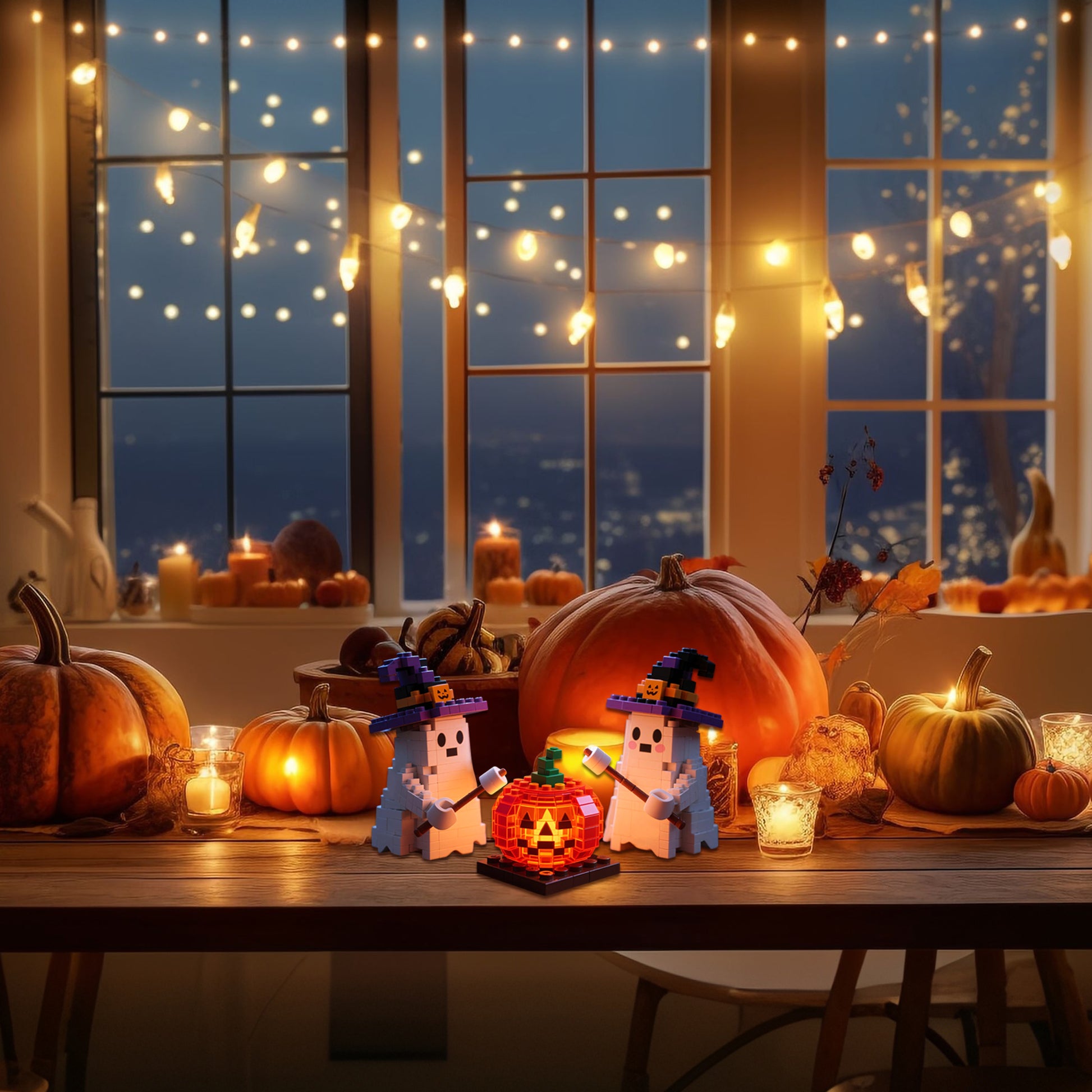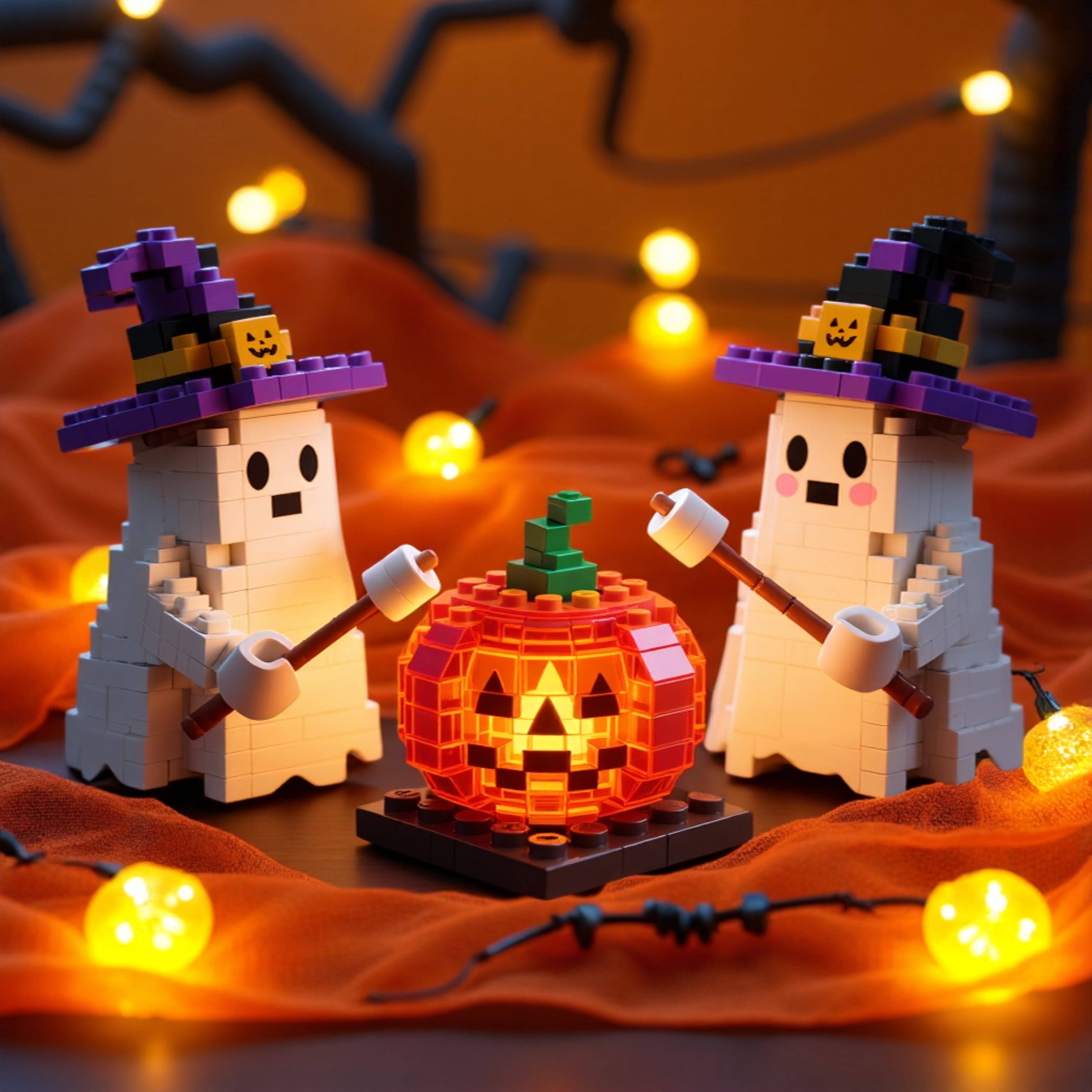 🔥🎃Celebrate the spirit of Halloween with this adorable micro-brick set featuring two cheeky little ghosts in witch hats, roasting marshmallows beside a glowing pumpkin.